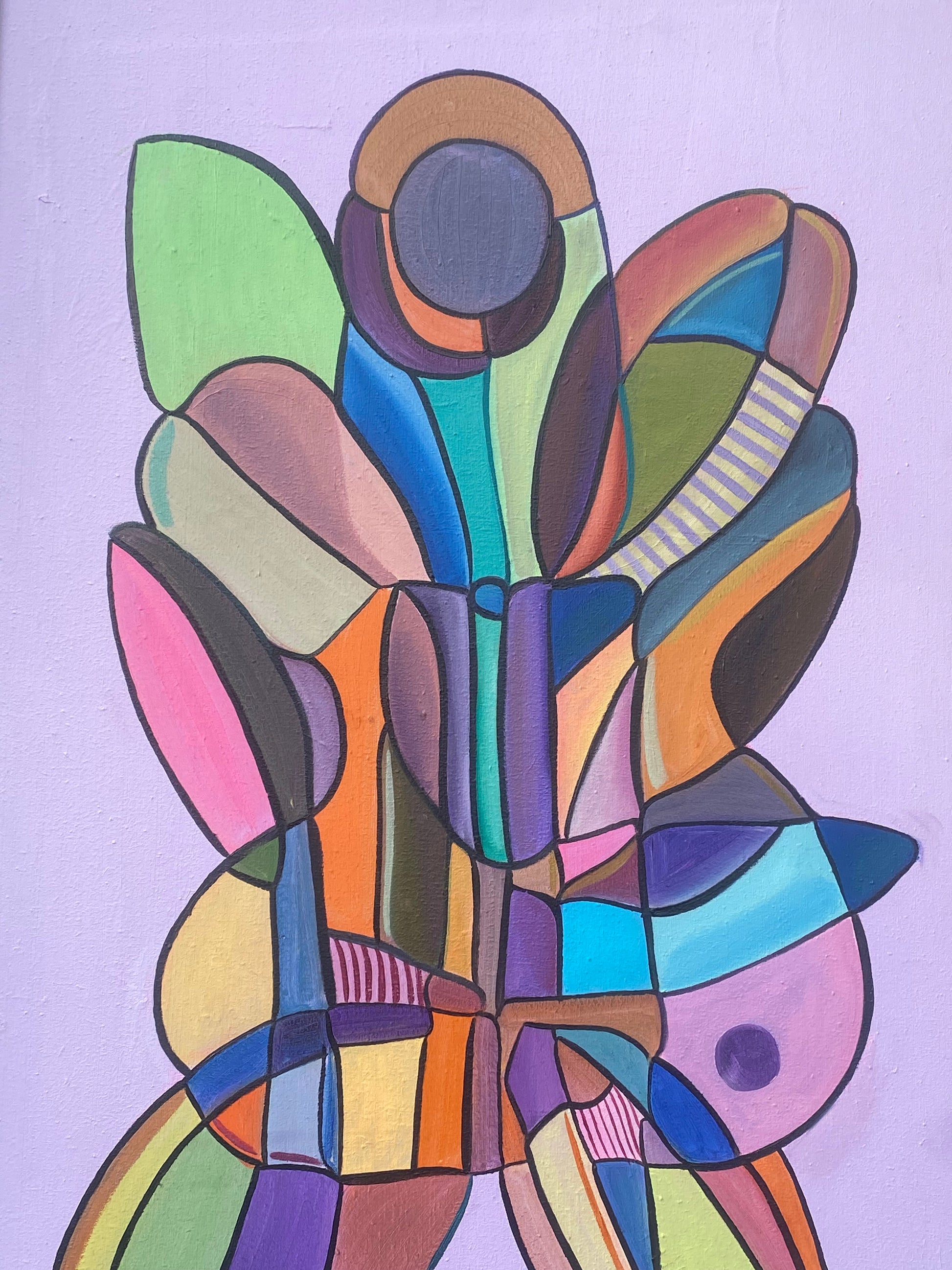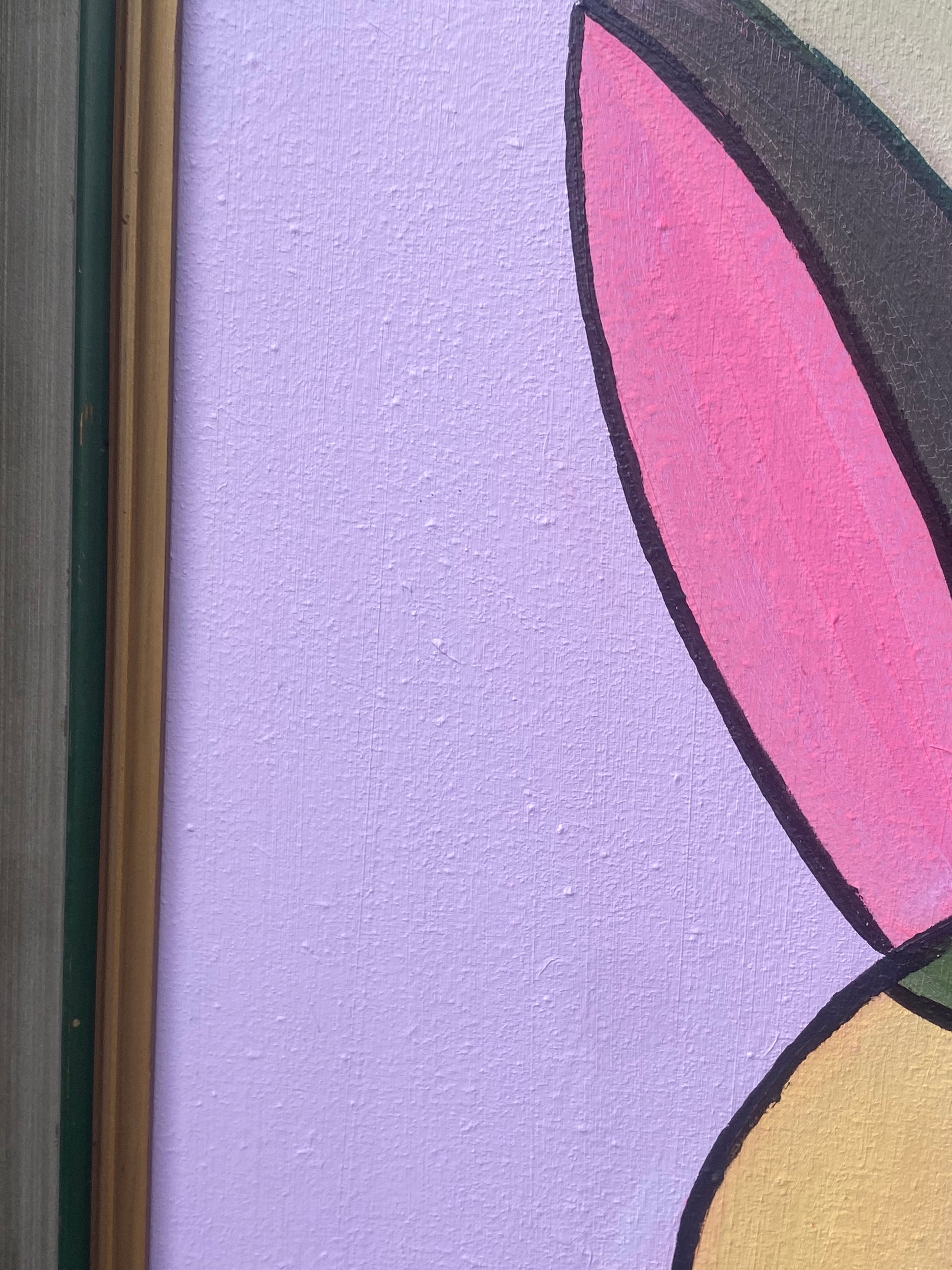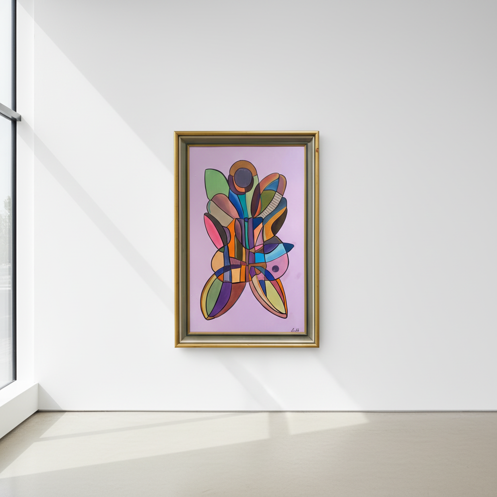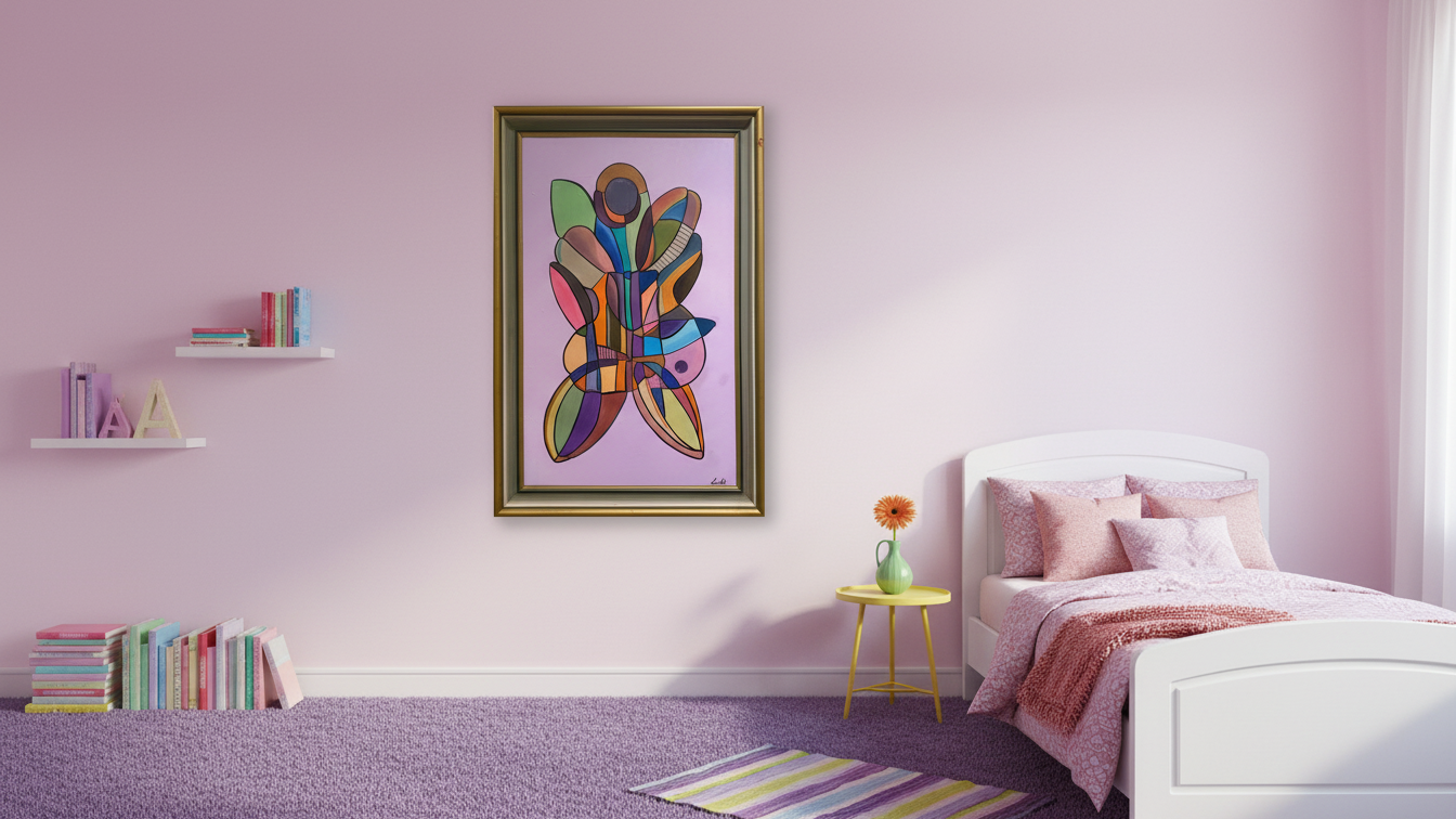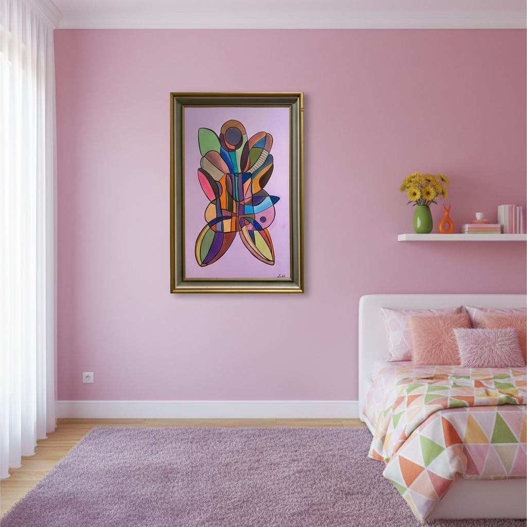 Den rosa tavlan Sommerfugl fångar känslan av en fjäril, med inslag av orange och grönt, där färgerna möts och separeras av svarta linjer. Verket symboliserar födelse på nytt, personlig utveckling och en positiv ny start. Med sina enkla former och påskfärger som rosa, gul och vårgröna nyanser, utstrålar tavlan en känsla av glädje och förnyelse. Den passar perfekt i ett flickrum och ger en ljus och hoppfull atmosfär.